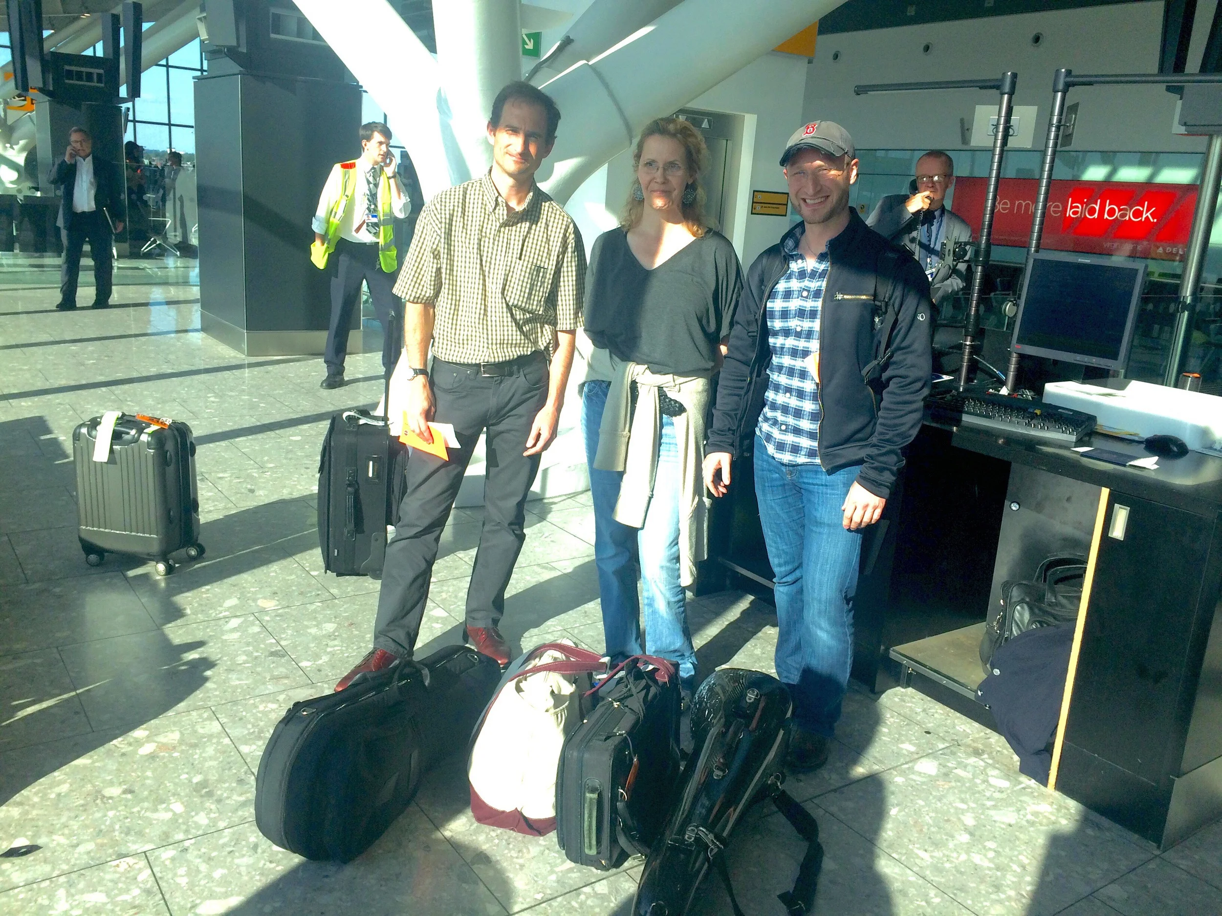 BSO Musicians and their "offending instruments" at the British Airways terminal waiting to board the flight home.